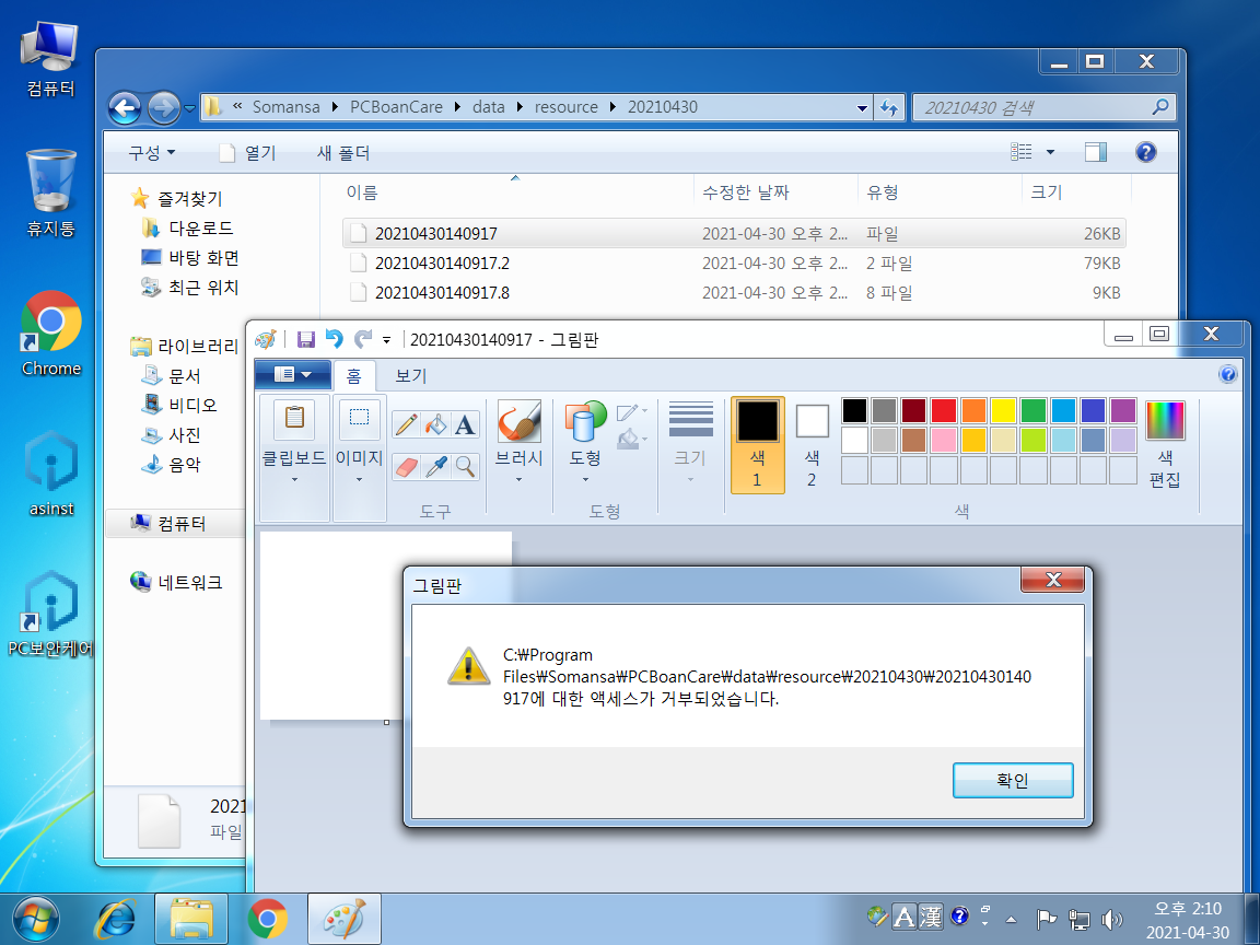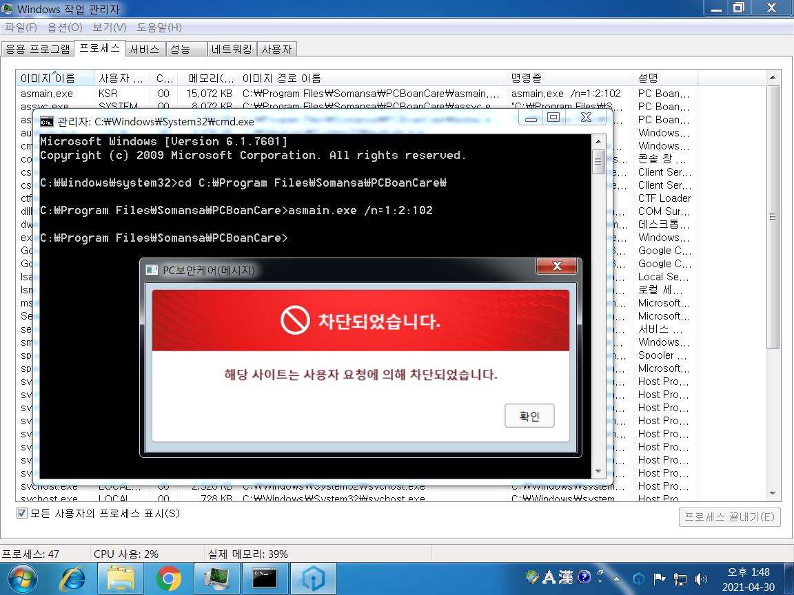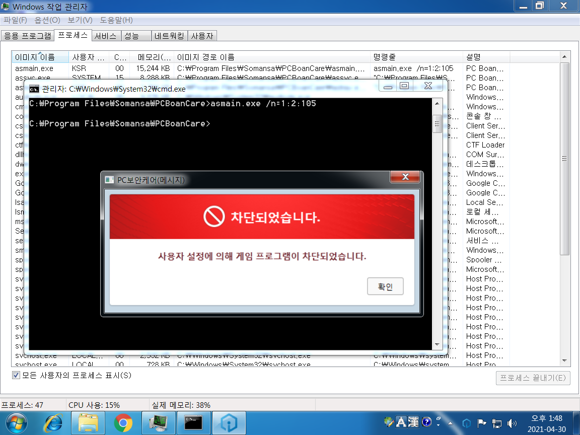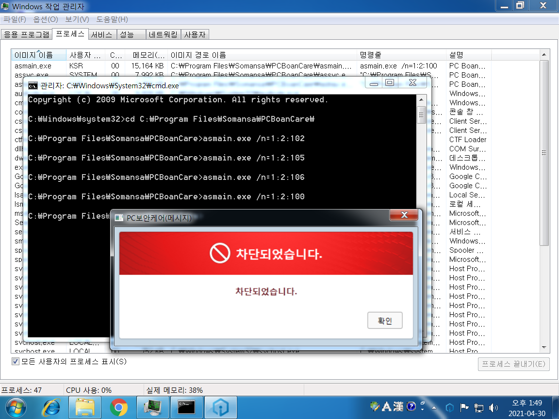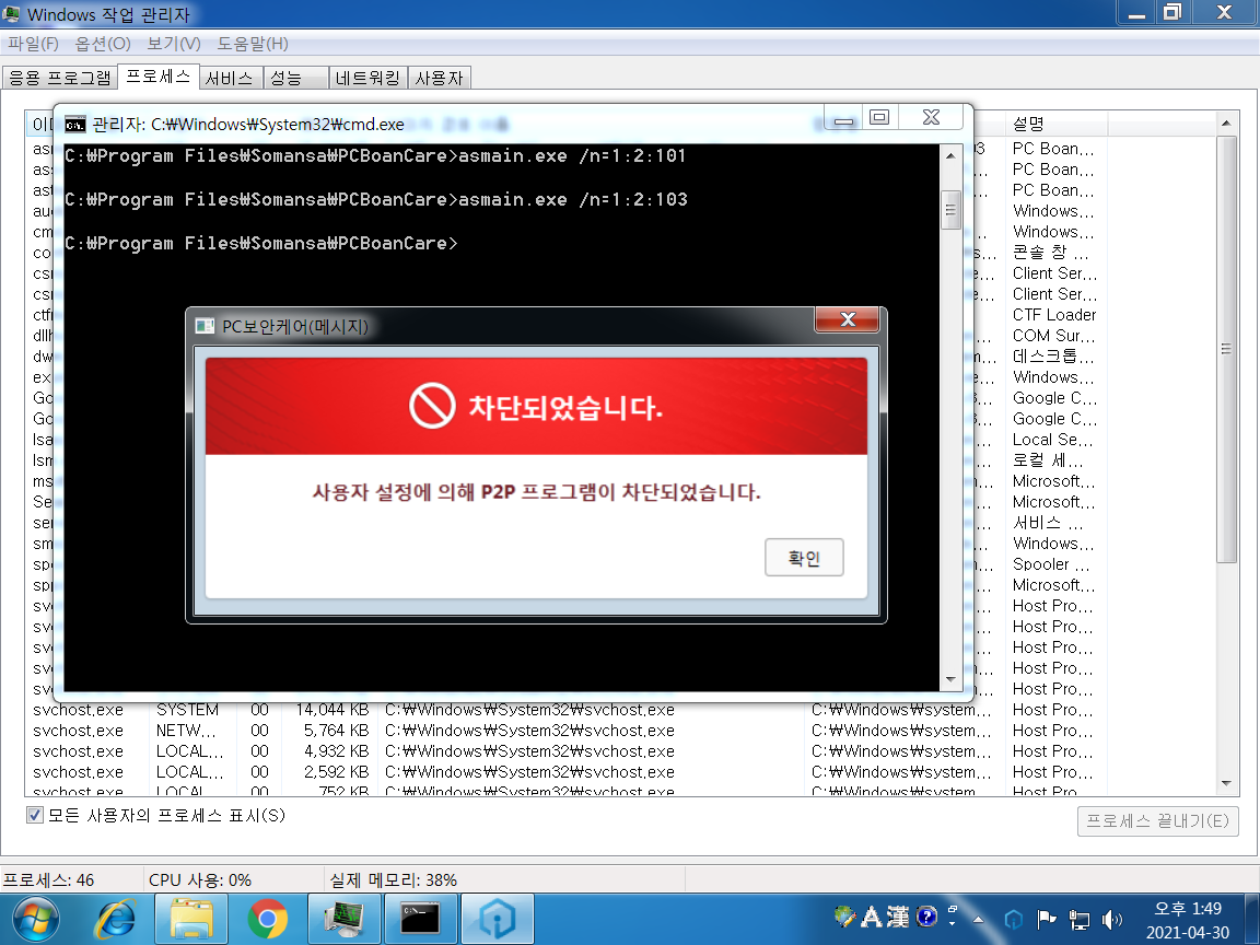V3 백신을 통한 프로세스 종료가 막혀있다.