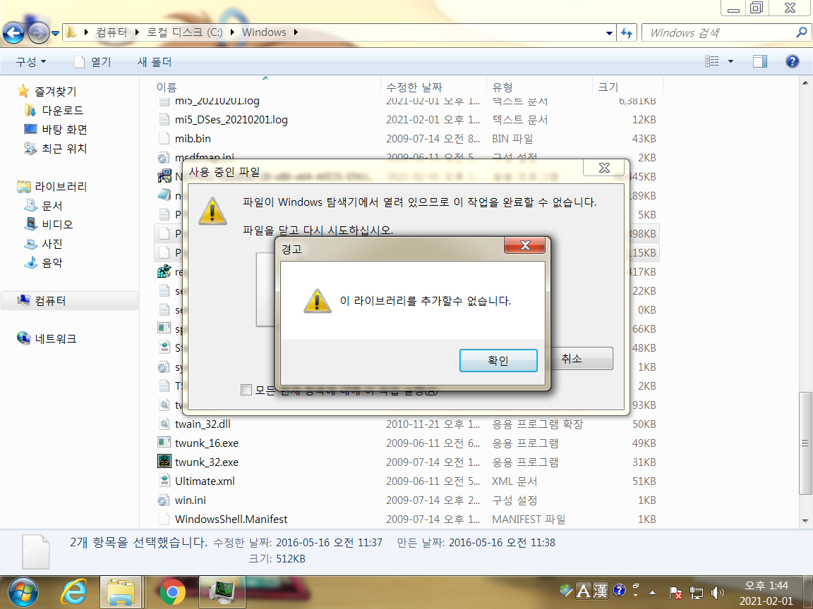 그리고 삭제할때는 권한 전부 풀어주시고 삭제하면 되지만, old 파일 같은 경우에는 계속 이 라이브러리를 추가할 수 없다면서 경고창이 계속 뜨는데 이때는 그냥 껏다가 다시 지우시면 정상적으로 삭제됩니다.