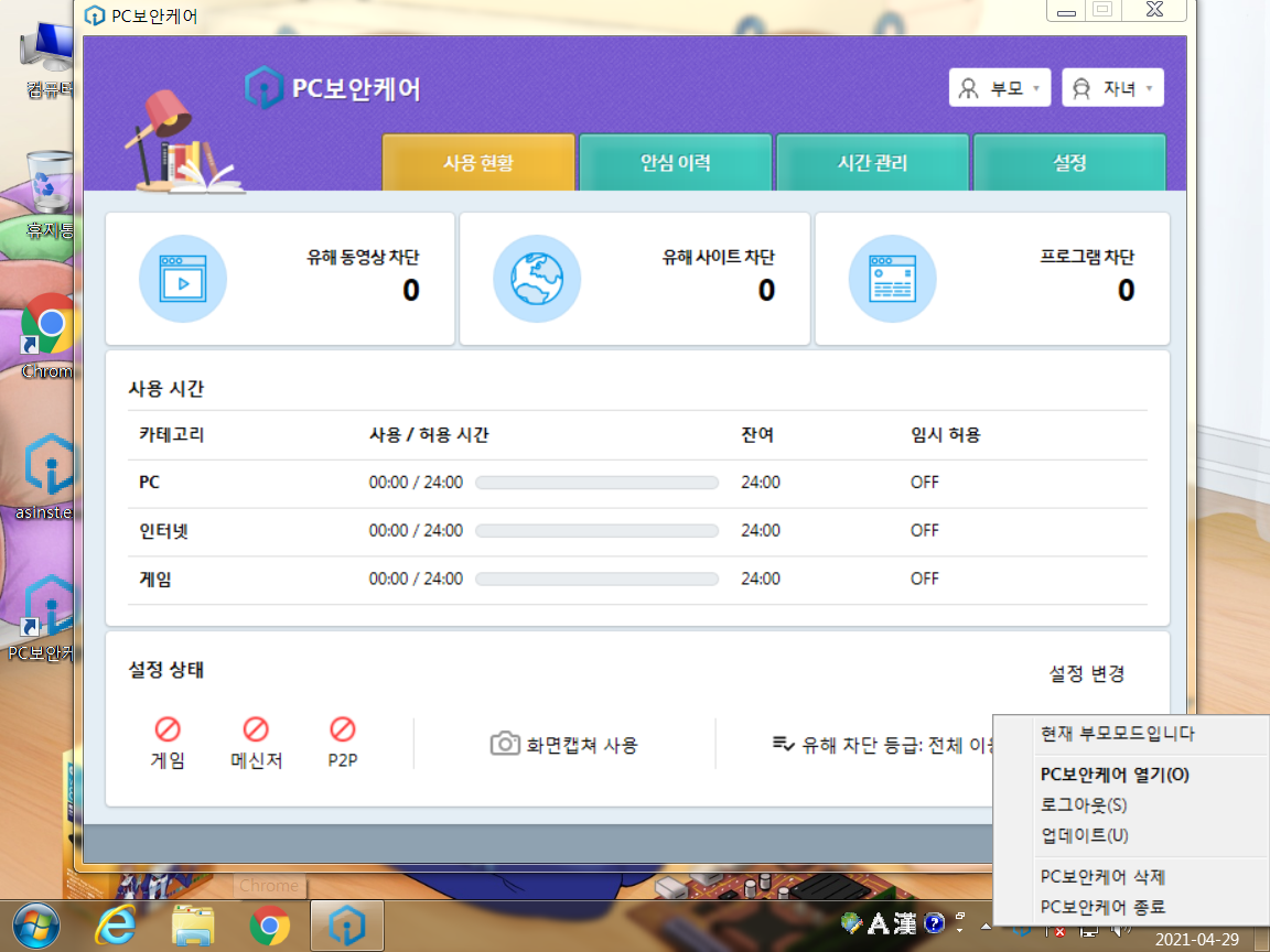 오늘도 적절한 PC보안케어를 띄워줍니다