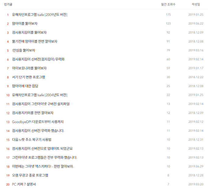 그리고 2위는 맘아이 뚫기고 3위는 컴사용지킴이 뚫기.