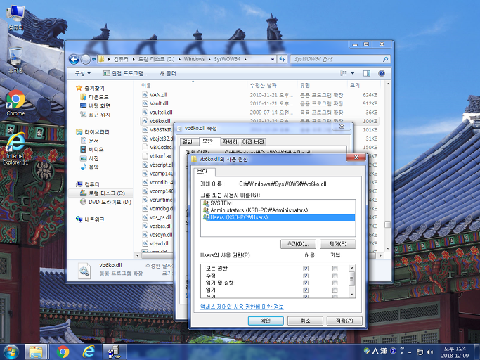 아까 전에 vb6ko.dll 위치로 가서 이번에는 권한을 전부 허용으로 바꿔준다.